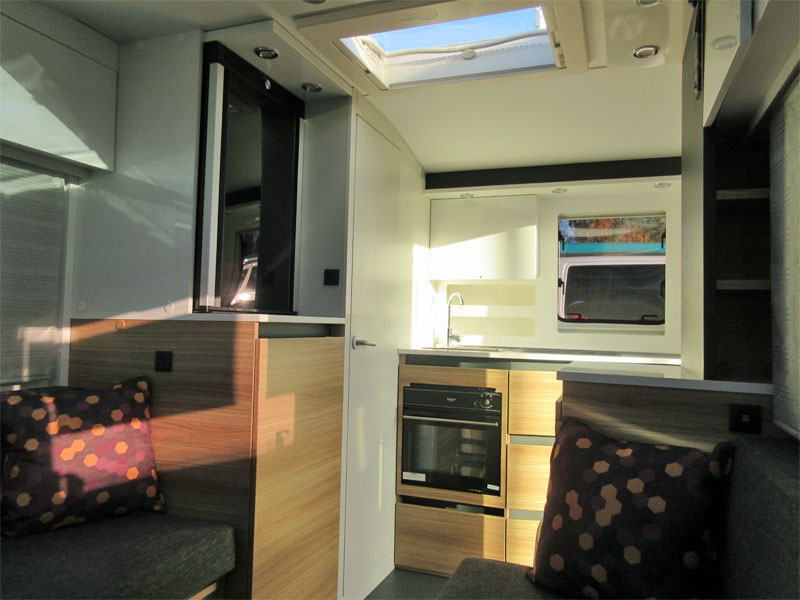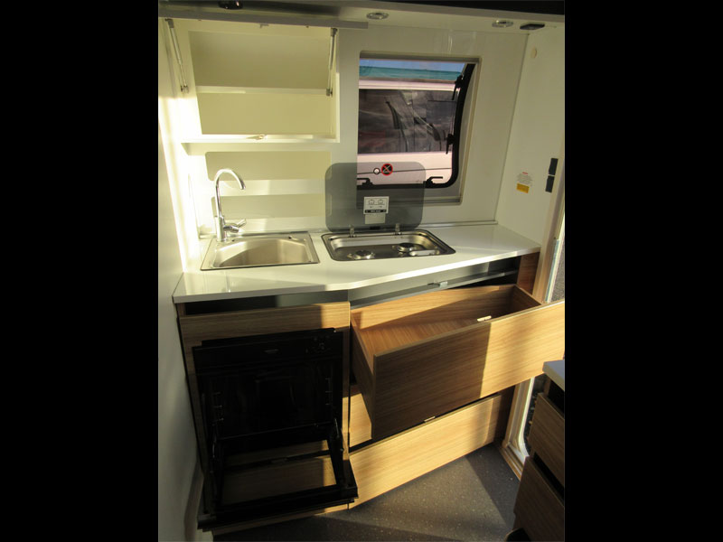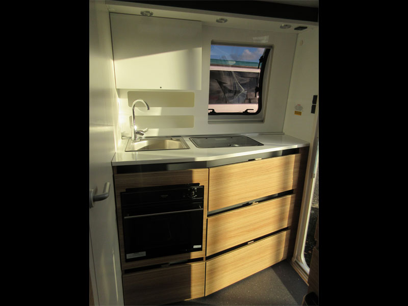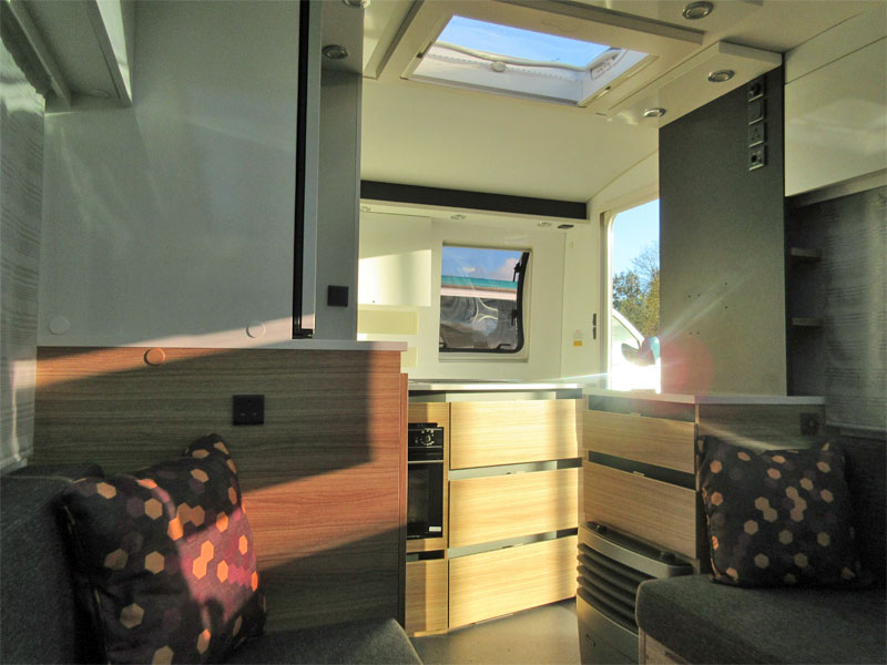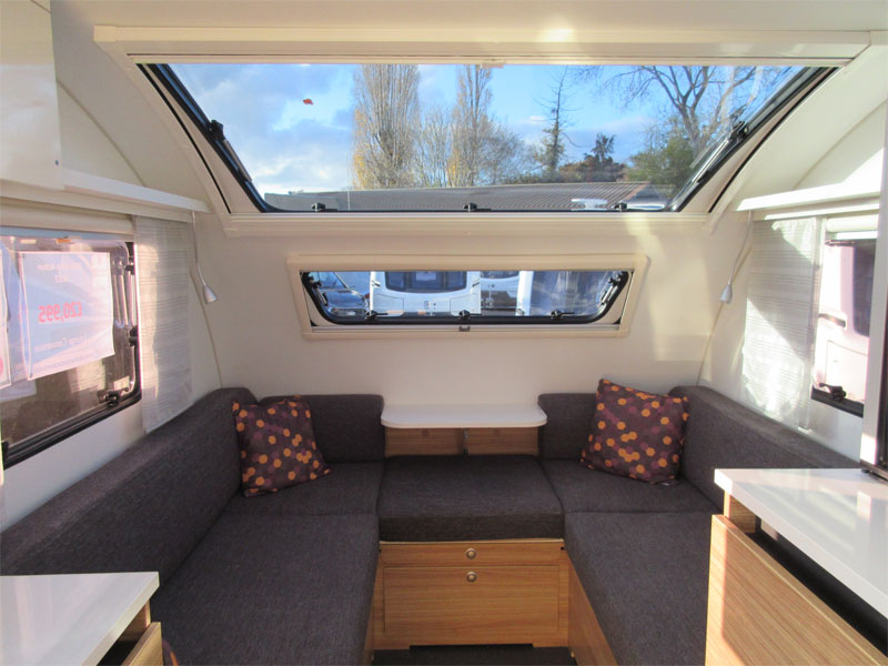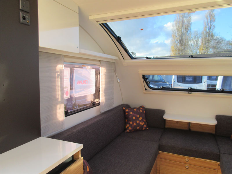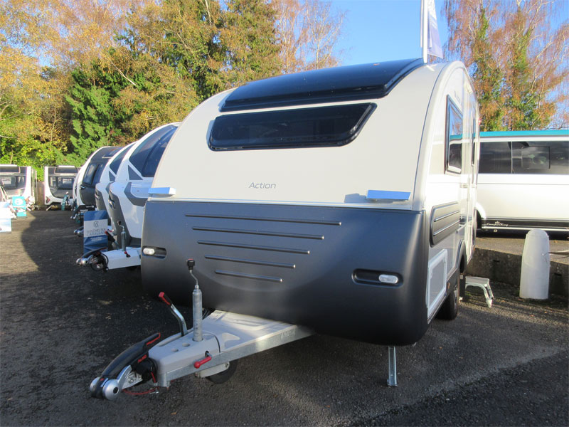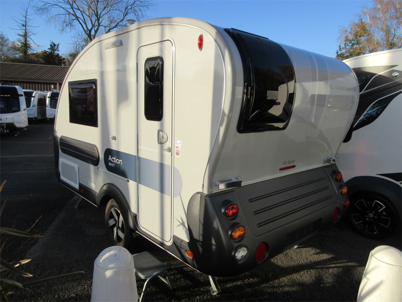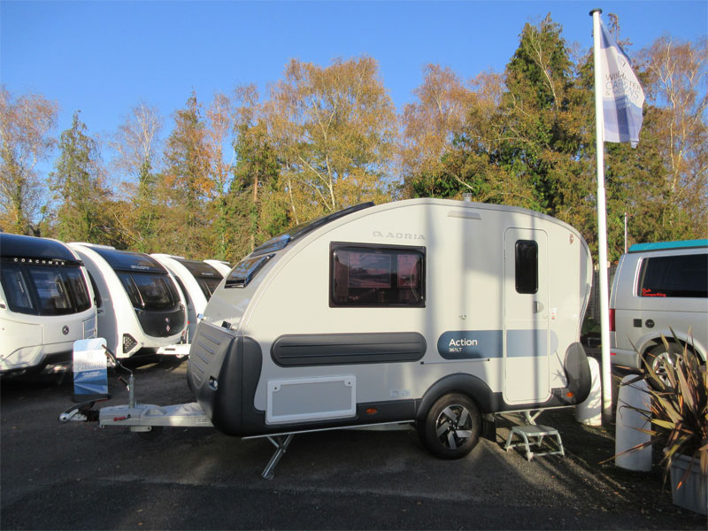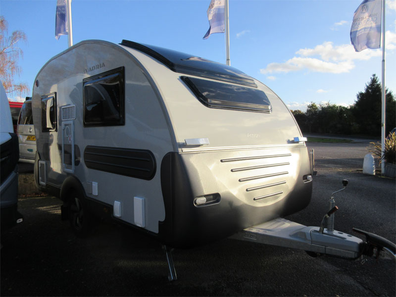 This 2 berth model has a rear kitchen with a great level of build quality and specification. This caravan has a spacious front living area that converts into a front double, comfortable rear kitchen and a combined rear washroom. The Slovenian made Adria is a caravan people who love the great outdoors, but still want a bit of comfort when they get back to base. This caravan is unique in its own right, it has bold silver and grey external panelling, a slanting profile, bubble kitchen window and an MTPLM of 1150kg and it's relatively short – it has a shipping length of just 5.21m. So its perfect for people who don't necessarily have a large driveway and want something that will stand out at campsites.