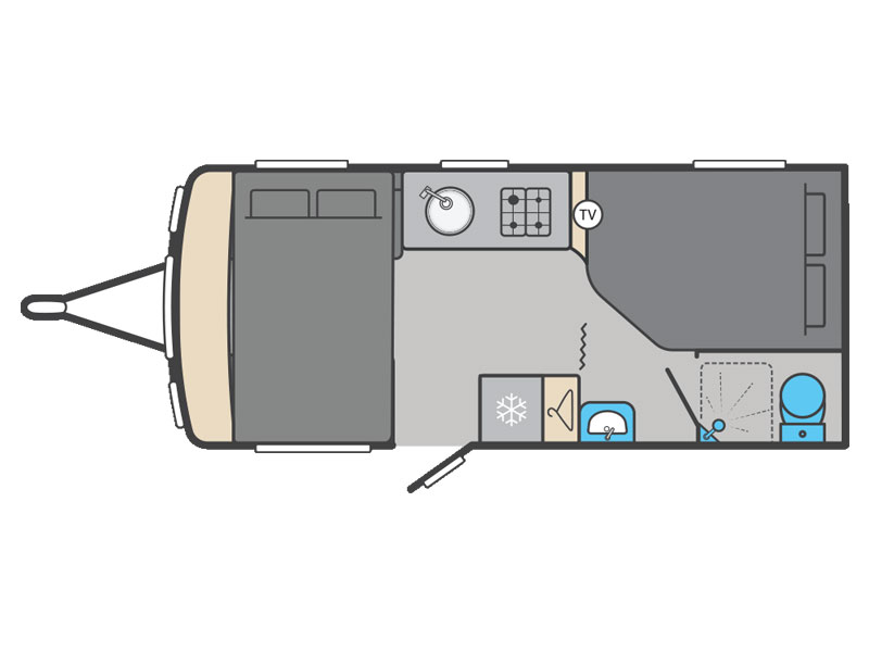 The Challenger 500 is a shorter single axle french style double bed layout with a combination washroom