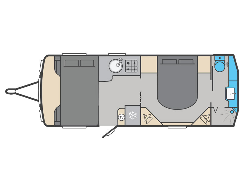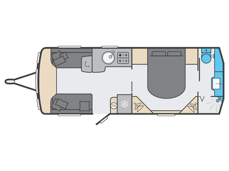 The 845 is a twin axle 8ft wide transverse island bed model, with large rear washroom and spacious front lounge.